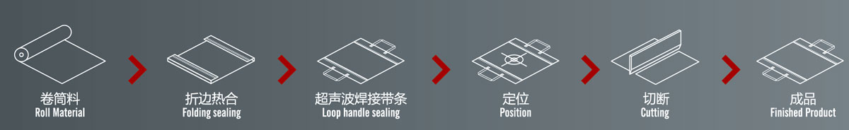 2.本機(jī)通過折邊后,再經(jīng)過左右兩臺(tái)燙把機(jī)把雙手提條焊好,裁切出來。